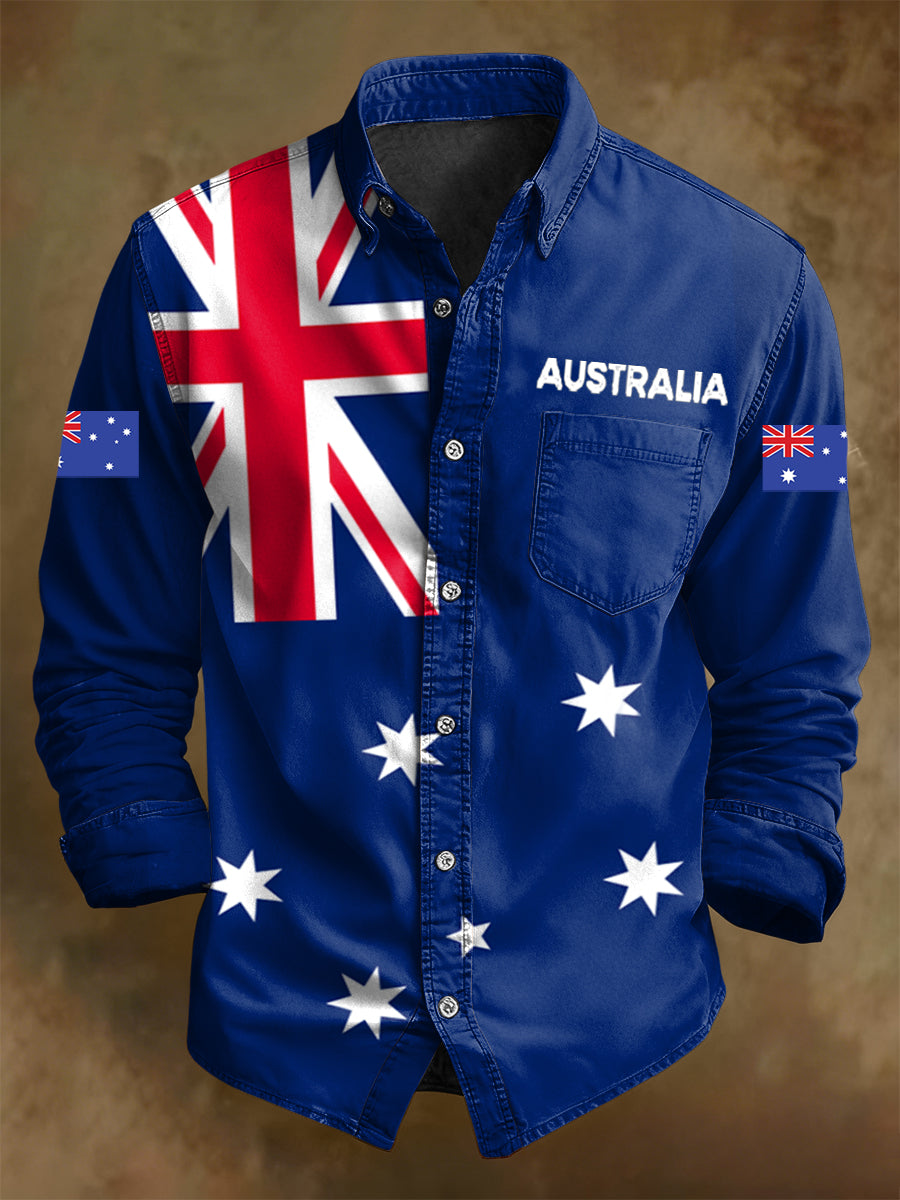 Men's Retro Australian Flag Badge Print Casual Long Sleeve Pocket Shirt