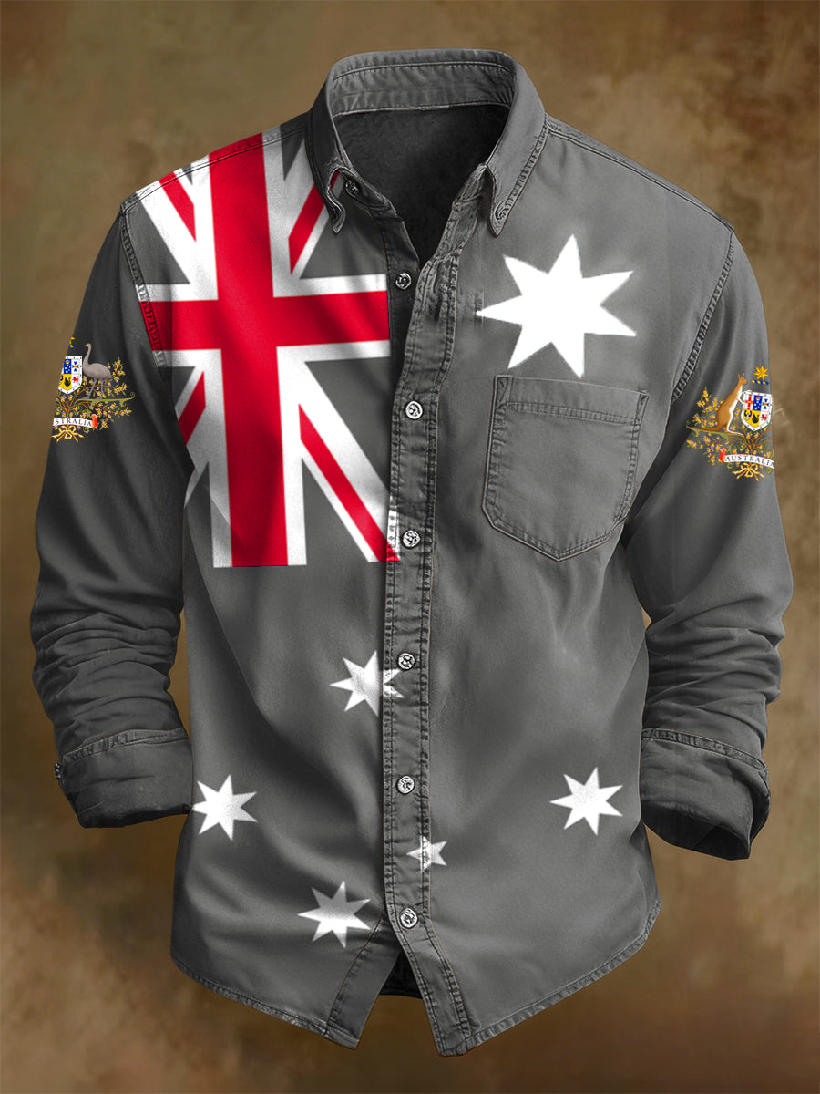 Men's Retro Australian Flag Badge Print Casual Long Sleeve Pocket Shirt